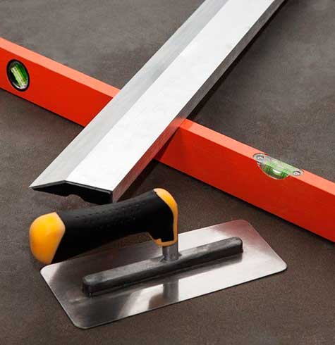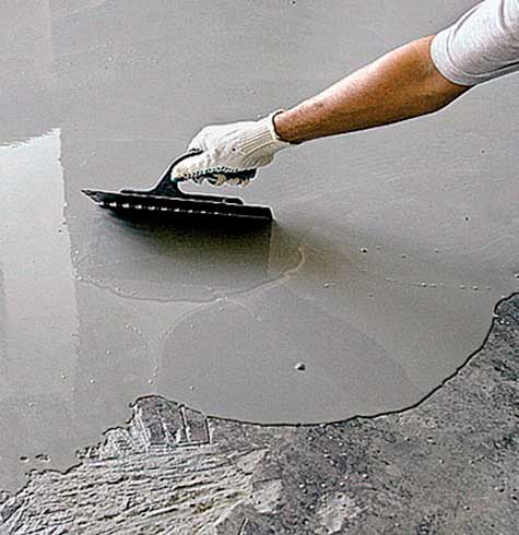 На следующем этапе по основанию распределяется необходимое количество цементно-песчаной смеси. Для ее выравнивания используется правило. Во избежание образования трещин нарезаются деформационные швы. После высыхания раствора специальной затирочной машиной проводится шлифовка поверхности.